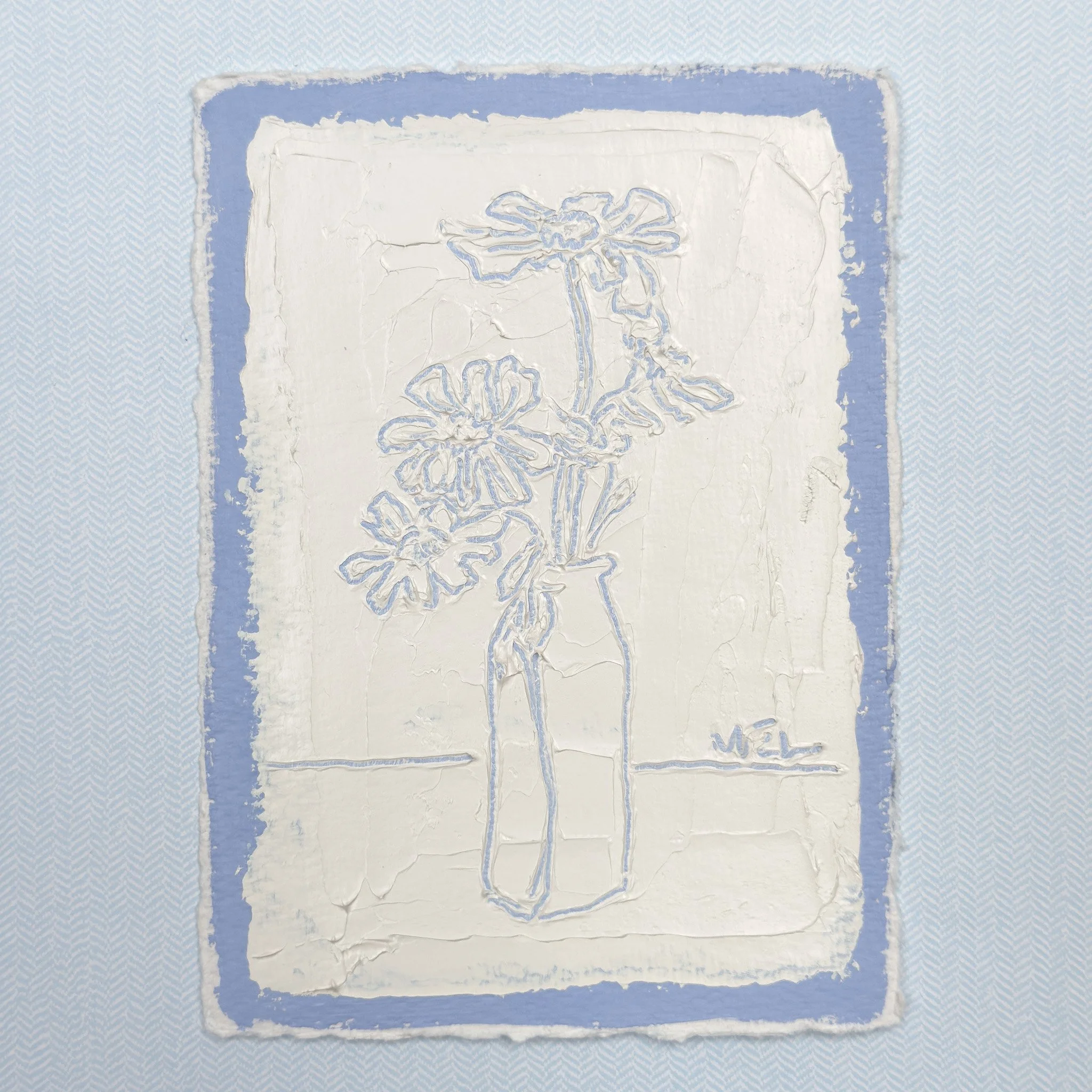 ‘Sketched Milk Bottle Cosmos in Blue’ is an original acrylic and oil floral painting on 100% cotton, handmade Nujabi paper. Inspired by the minimalist sketches of Picasso, this piece features a carved illustration of delicate cosmos in a milk bottle vase. Set against a soothing periwinkle blue background, the artwork combines textured oil paint with the unique grain of soft cold-pressed paper. Ideal for lovers of minimalist and floral art, this one-of-a-kind piece brings both elegance and sentimentality to your space. Part of a limited collection of 18, each painting tells a story of quiet beauty and emotional resonance.